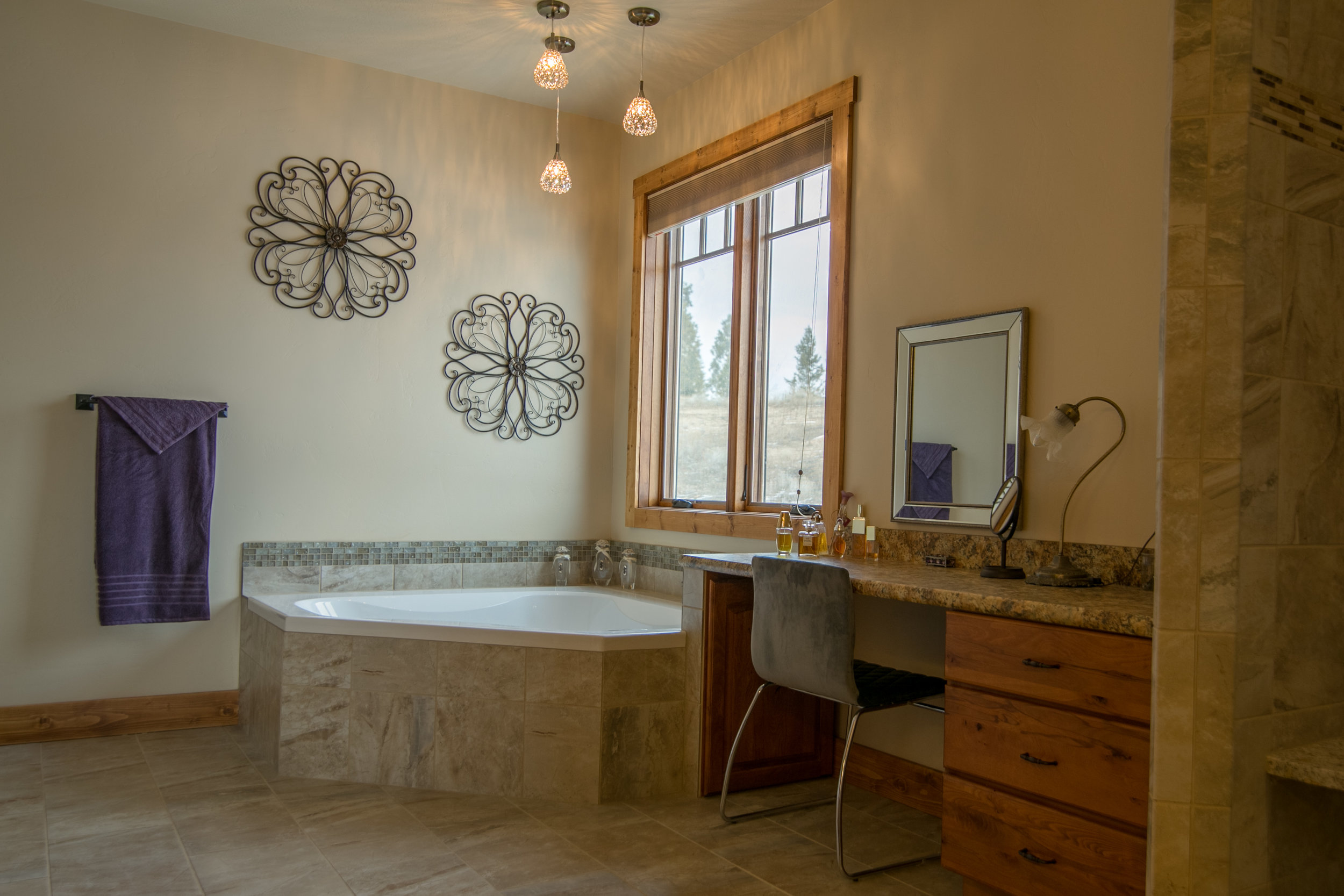 The homeowners and Greg worked together to design and construct a Craftsman-style home without the steep imposing roofline. The home was constructed with large beams in the entry, rustic carpentry, and pine.